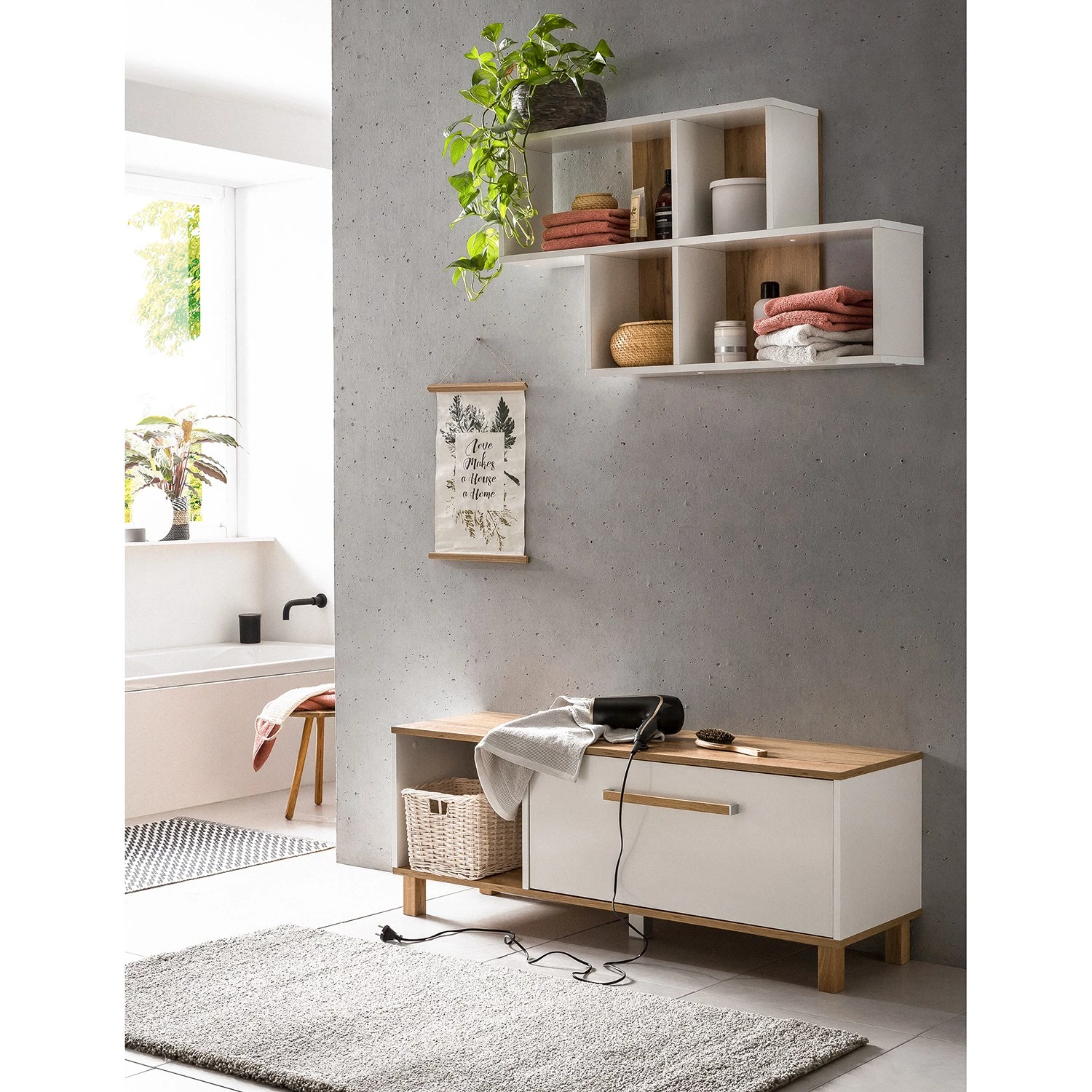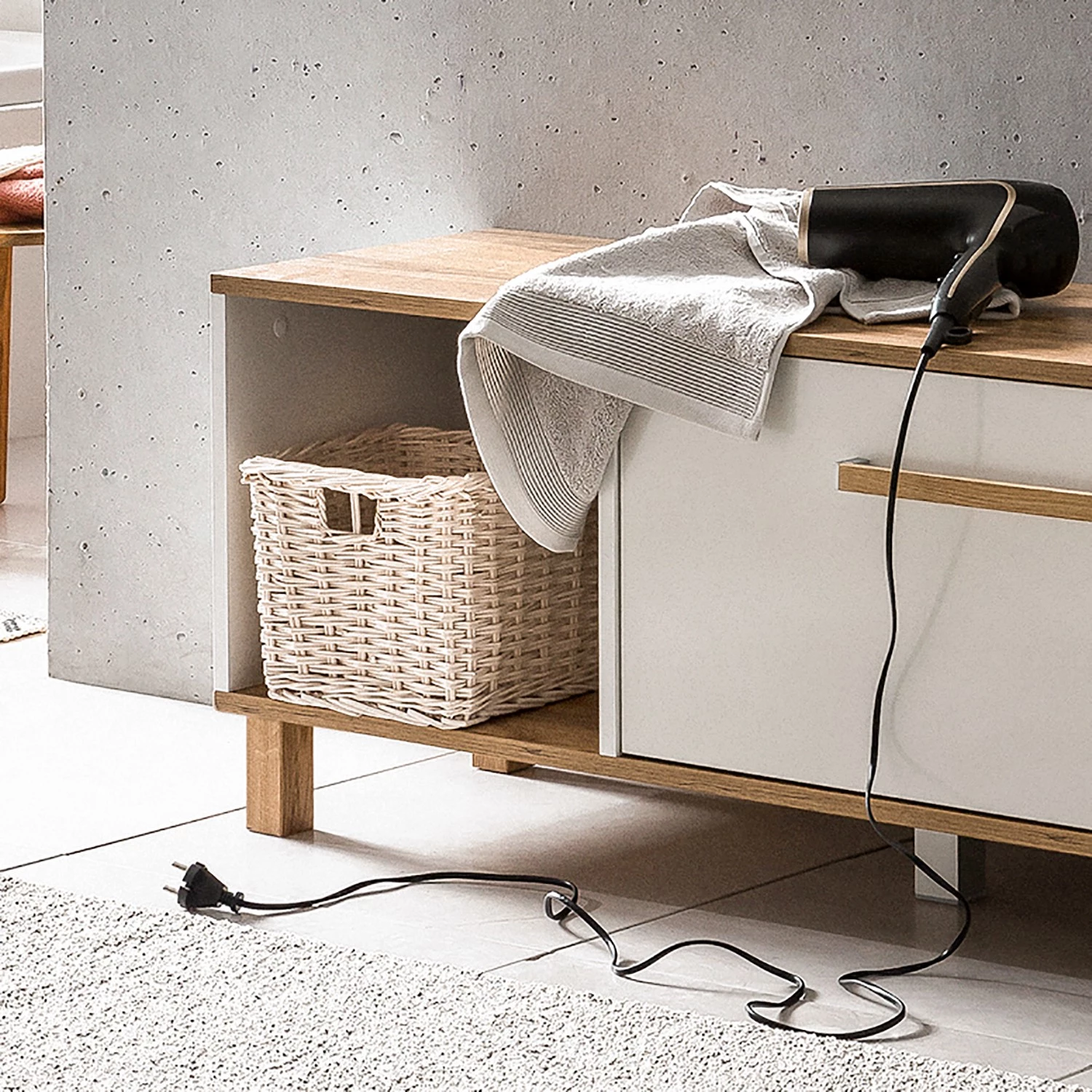 - Éléments décoratifs, poignées et pieds : chêne